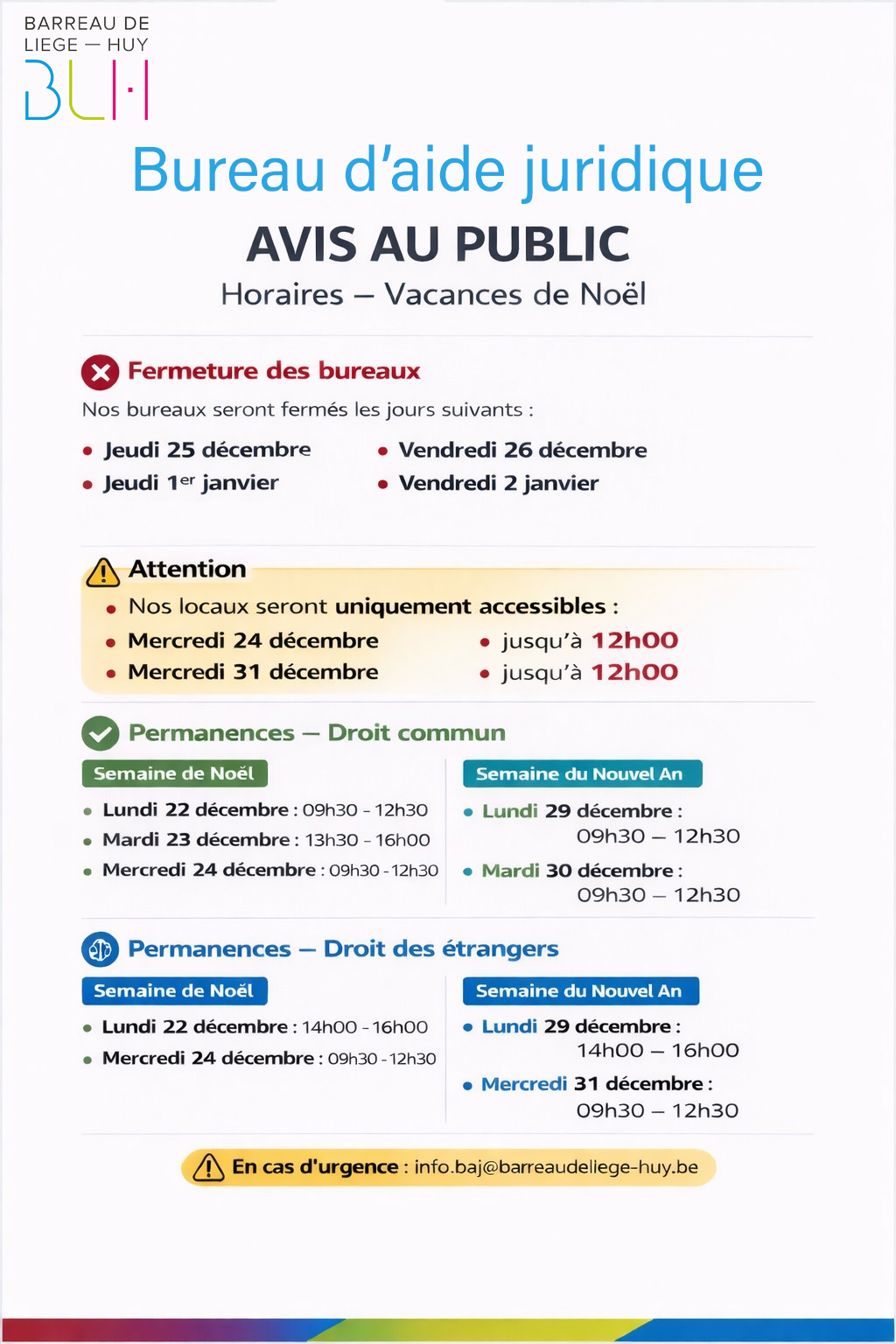 Les horaires d'ouverture du Bureau d'Aide Juridique, situé dans l'ancien Palais des Princes-Evêques, sont adaptés pour la période comprise entre le 25 décembre 2025 et le 02 janvier 2026.